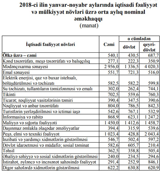 2018-ci ilin yanvar-noyabr aylarında ölkə iqtisadiyyatında muzdla çalışan işçilərin orta aylıq nominal əməkhaqqı 2017-ci ilin müvafiq dövrünə nisbətən 2,9 faiz artaraq 540,1 manat təşkil etmişdir.