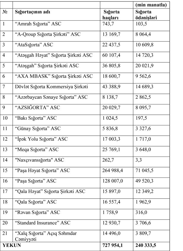 Sığorta haqları və sığorta ödənişləri -ŞİRKƏTLƏR ÜZRƏ