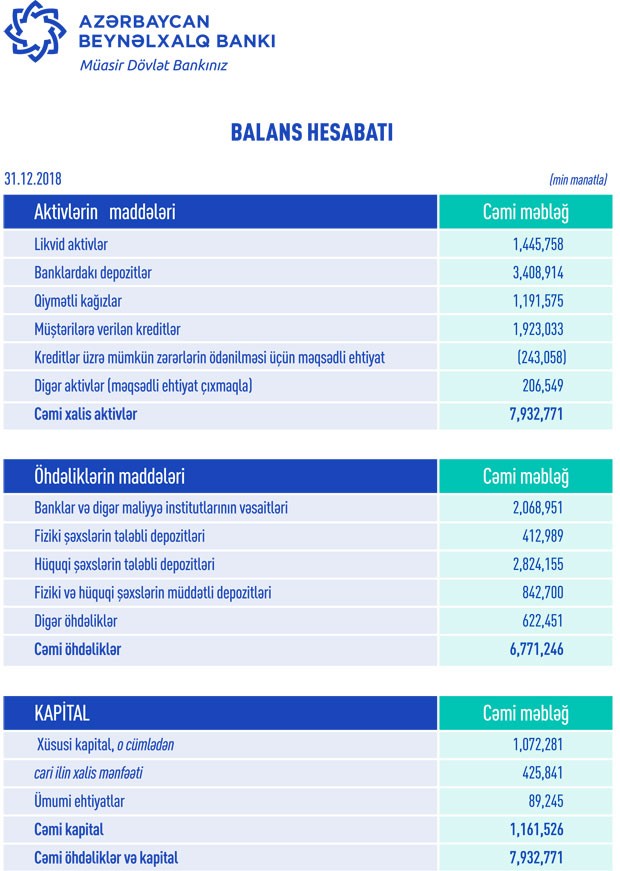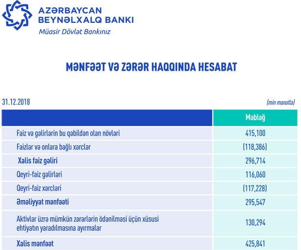 zərbaycan Beynəlxalq Bankı 2018-ci ili 425,8 milyon manat xalis mənfəətlə başa vurub.