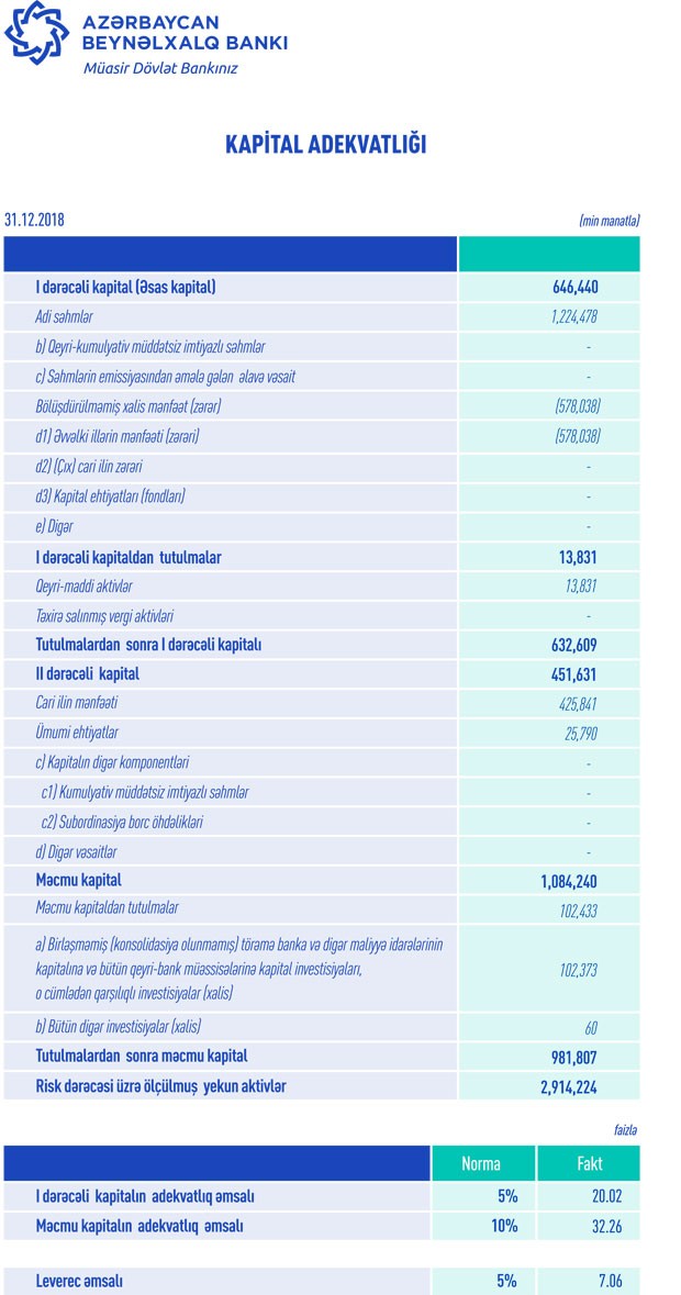 31 dekabr 2018-ci il tarixinə Azərbaycan Beynəlxalq Bankının aktivləri 7.9 milyard manat təşkil edib. İl ərzində gəlirliliyin artırılması, xərclərin optimallaşdırılması, xidmət keyfiyyətinin yüksəldilməsi istiqamətində həyata keçirilən davamlı tədbirlər sayəsində bankın kapital mövqeyi daha da möhkəmlənib. Belə ki, Azərbaycan Beynəlxalq Bankının məcmu kapitalı 2018-ci ildə də artaraq 982 milyon manata çatıb. Kapital adekvatlığı isə 17%-dən 32%-ə yüksəlib.