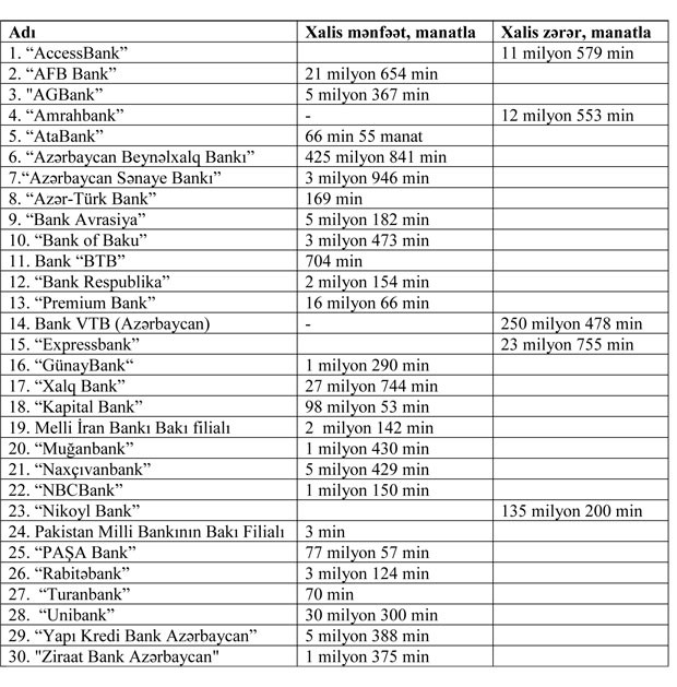 25 bank mənfəət, 5 bank zərər açıqladı - SİYAHI