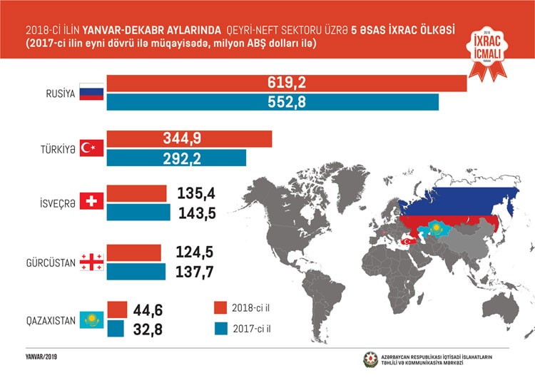Ötən il ərzində Rusiyaya 619,2 milyon, Türkiyəyə 344,9 milyon, İsveçrəyə 135,4 milyon Gürcüstana 124,5 milyon və Qazaxıstana 44,6 milyon ABŞ dolları dəyərində qeyri-neft sektoruna aid mal ixrac edilib. 2017-ci illə müqayisədə 2018-ci il ərzində Rusiyaya qeyri-neft ixracı 12%, Türkiyəyə 18%, İsveçrəyə 1%, Qazaxıstana 36% artmış, İsveçrəyə 6%, Gürcüstana isə 10% azalıb.