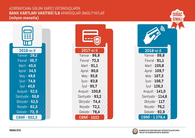 2018-ci ildə ölkəmizə gələn xarici vətəndaşların bank kartları vasitəsi ilə xərcləmələrində də dinamik artım müşahidə edilib. Belə ki, 2018-ci ilin yanvar-dekabr ayları ərzində Azərbaycana gələn xarici vətəndaşların bank kartları vasitəsi ilə apardıqları əməliyyatların dəyəri 1278,4 milyon manat təşkil edib. 2017-ci ilin müvafiq dövrü ilə müqayisədə 2018-ci ilin yanvar-dekabr ayları ərzində Azərbaycana gələn xarici vətəndaşların bank kartları vasitəsi ilə apardıqları əməliyyatların dəyəri 256 milyon manat və ya 25 faiz artıb.