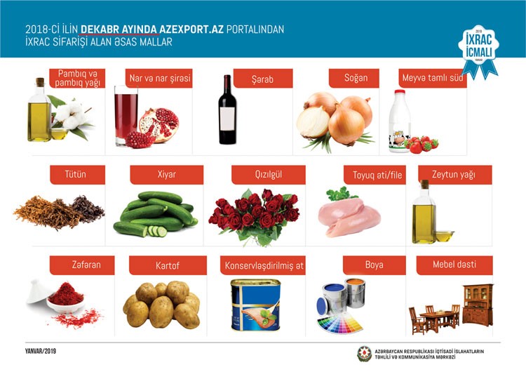 Məlumat üçün qeyd edək ki, 2017-ci ilin yanvar ayından 2018-ci ilin 31 dekabr tarixinə kimi (24 ay ərzində) Azexport.az portalına dünyanın 115 ölkəsindən daxil olan ixrac sifarişlərinin dəyəri 989,1 milyon ABŞ dolları təşkil edib.