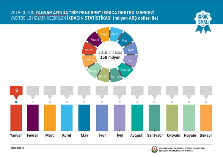 Həmçinin “İxrac İcmalı”nda “Bir Pəncərə” İxraca Dəstək Mərkəzinin fəaliyyəti barədə də məlumat verilib. Qeyd edilib ki, bu ilin yanvar ayında “Bir Pəncərə” İxraca Dəstək Mərkəzi tərəfindən fiziki və hüquqi şəxslərə bir pəncərə prinsipi əsasında ixracla bağlı tələb olunan sertifikatlar verilib. “Bir Pəncərə” İxraca Dəstək Mərkəzi vasitəsi ilə həyata keçirdikləri ixracın dəyəri isə 8 milyon ABŞ dolları olub.