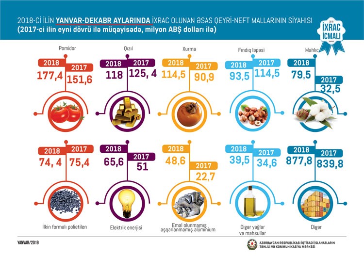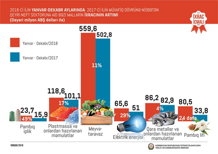 Ümumiyyətlə, 2018-ci ilin yanvar-dekabr ayları ərzində meyvə-tərəvəz ixracı 560 milyon, plastmassa və onlardan hazırlanan məmulatların ixracı 118,6 milyon, alüminium və ondan hazırlanan məmulatların ixracı 112,2 milyon, elektrik enerjisinin ixracı 65,6 milyon, qara metallar və onlardan hazırlanan məmulatların ixracı 86,2 milyon, pambıq lifi ixracı 80,5 milyon, kimya sənayesi məhsullarının ixracı 78,1 milyon, pambıq ipliyi ixracı 24 milyon ABŞ dolları təşkil edib. 2017-ci illə müqayisədə 2018-ci ildə pambıq lifinin ixracı 2,4 dəfə, elektrik enerjisinin ixracı 29 faiz, pambıq ipliyinin ixracı 49 faiz, plastmassa və onlardan hazırlanan məmulatların ixracı 17 faiz, meyvə-tərəvəzin ixracı 11 faiz, qara metallar və onlardan hazırlanan məmulatların ixracı 4 faiz artıb.