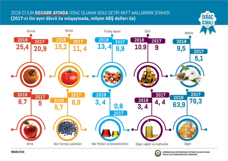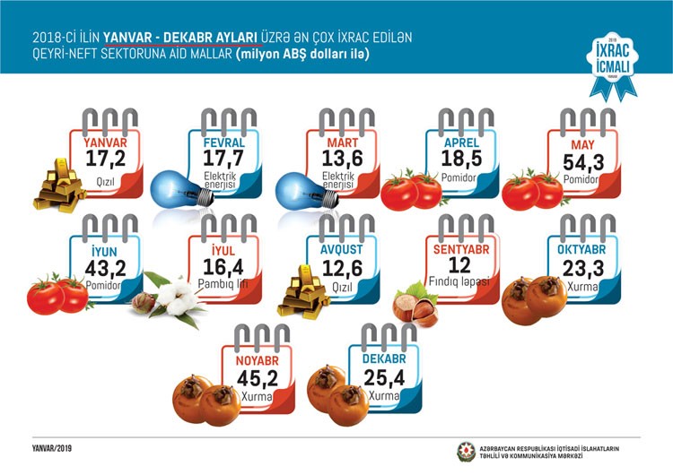2018-ci ilin dekabr ayında qeyri-neft sektoru üzrə ixracda xurma (25,4 milyon ABŞ dolları) birinciliyi ələ alıb. Pomidor (15,2 milyon ABŞ dolları) ilə fındıq ləpəsi (13,4 milyon ABŞ dolları) isə ikinci və üçüncü yeri bölüşüblər.