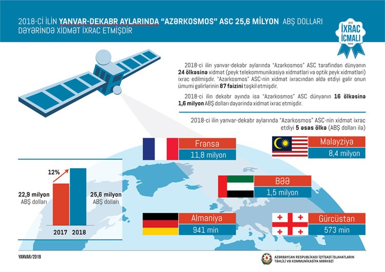 “Azərkosmos” ASC-nin xidmət ixracından əldə etdiyi gəlir onun ümumi gəlirlərinin 87 faizini təşkil edib. 2018-ci ilin dekabr ayında isə “Azərkosmos” ASC dünyanın 16 ölkəsinə 1,6 milyon ABŞ dolları dəyəri xidmət ixrac edib. 2017-ci illə müqayisədə 2018-ci ildə “Azərkosmos” ASC-nin xidmət ixracı 12 faiz artıb.
