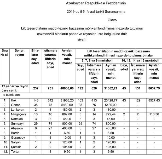 "Marja" xəbər verir ki, Azərbaycanın 12 şəhər və rayonunda 237 çoxmənzilli binanın lift təsərrüfatının maddi-texniki bazasının möhkəmləndirilməsi məqsədilə 2019-cu il dövlət büdcəsindən bu Sərəncama əlavə edilmiş siyahıya uyğun olaraq şəhər, rayon icra hakimiyyətlərinə 40 milyon manatı ayrılıb.