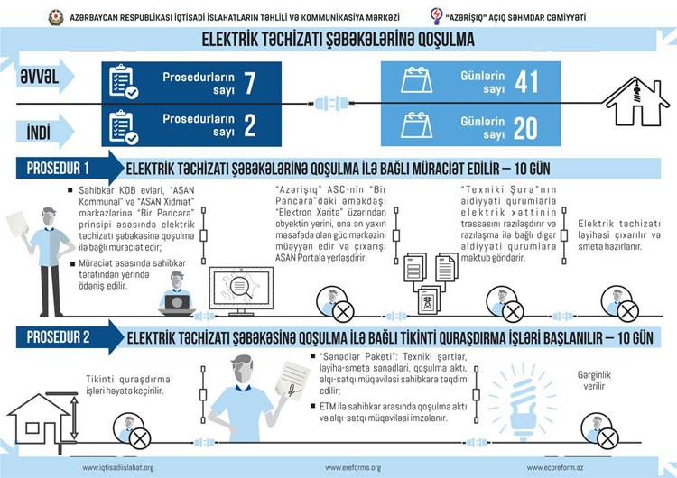 Qeyd edək ki, Prezident İlham Əliyevin Fərmanına əsasən ötən ilin dekabr ayının 25-də sahibkarlıq obyektlərinin elektrik şəbəkəsinə qoşulması üçün müddət 24 gündən 20 günə, prosedurlar isə 3-dən 2-ə endirilib.