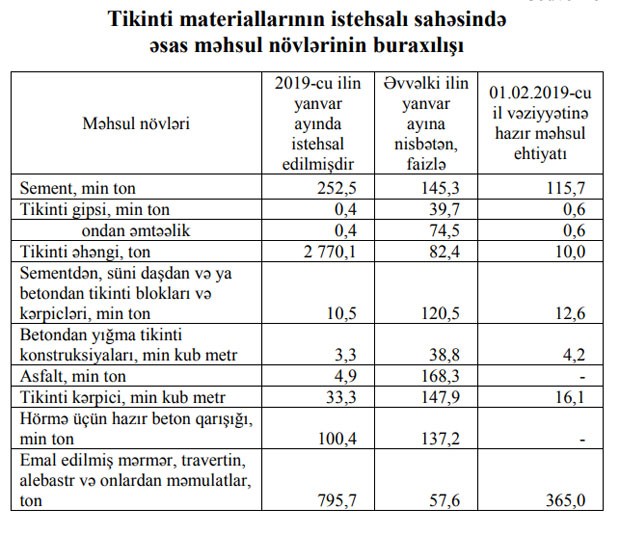 “Marja” Dövlət Statistika Komitəsinin aylıq hesabatına istinadən xəbər verir ki, tikinti kərpicinin istehsalı 47,9 faiz, sementin istehsalı 45,3 faiz, hörmə üçün hazır beton qarışığının istehsalı 37,2 faiz artmış, tikinti əhənginin istehsalı 17,6 faiz, tikinti gipsinin istehsalı 60,3 faiz, betondan yığma tikinti konstruksiyalarının istehsalı 61,2 faiz azalmışdır.