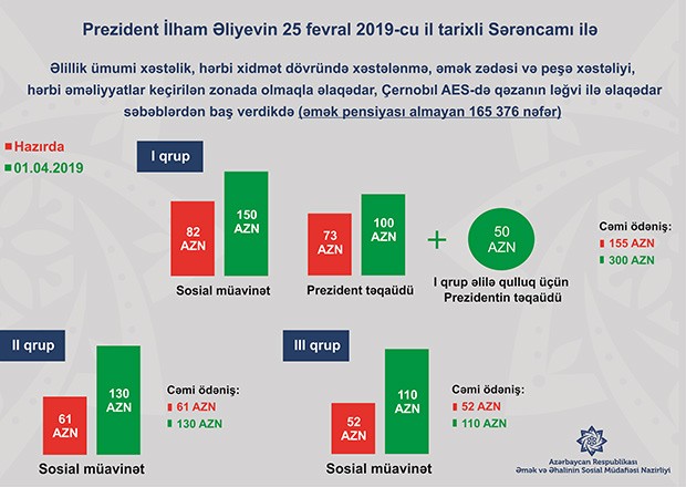 Bildirilib ki, Azərbaycan Prezidenti İlham Əliyevin “Əhalinin sosial müdafiəsinin gücləndirilməsi sahəsində əlavə tədbirlər haqqında” 25 fevral 2019-cu il tarixli sərəncamı 577 minədək vətəndaşın rifahının yaxşılaşdırılması istiqamətində əhəmiyyətli irəliləyişə imkan verib. Onlardan 165 min 376 nəfəri ümumi xəstəlik, hərbi xidmət dövründə xəstələnmə, əmək zədəsi və peşə xəstəliyi, hərbi əməliyyatlar keçirilən zonada olmaqla əlaqədar, Çernobıl AES-də qəzanın ləğvi ilə əlaqədar səbəblərdən əlilliyi olan (əmək pensiyası almayan) vətəndaşlardır.