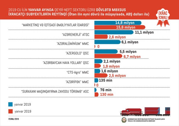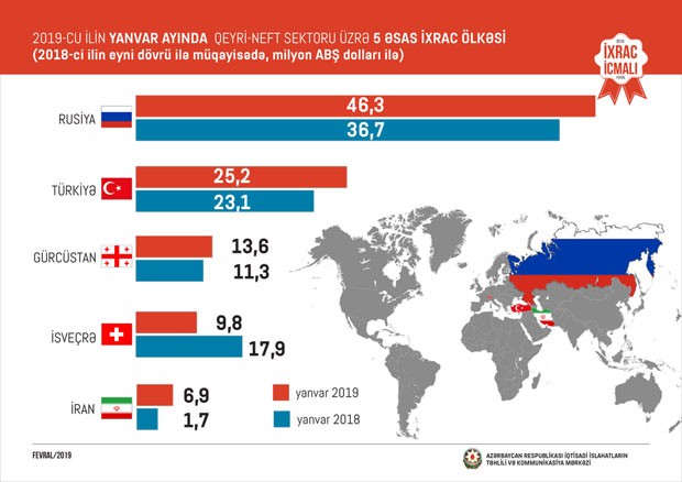 2018-ci ilin müvafiq dövrü ilə müqayisədə 2019-cu ilin yanvar ayı ərzində Rusiyaya qeyri-neft ixracı 26%, Türkiyəyə 9%, Gürcüstana 20%, İrana 4,1 dəfə artıb.