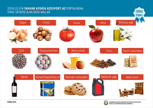 Daxil olan sifarişləri məhsullar üzrə təhlil etdikdə məlum olub ki, 2019-cu ilin yanvar ayında ən çox ixrac sifarişi soğan, fındıq ləpəsi, pomidor, alma, pambıq yağı, toyuq yumurtası, meyvə şirəsi, tütün, tikinti materialları, şərab, konservləşdirilmiş ət, qənnadı məhsulları, mühərrik yağı, mebel dəsti, nar şirəsi, kosmetik vasitə və s. mallara daxil olub.