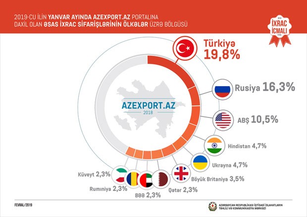 Cari ilin yanvar ayı ərzində portala daxil olan ixrac sifarişlərinin ilk beşliyində isə Türkiyə (19,8%), Rusiya(16,3%), ABŞ (10,5%), Hindistan (4,7%) və Ukrayna (4,7%) qərarlaşıb.
