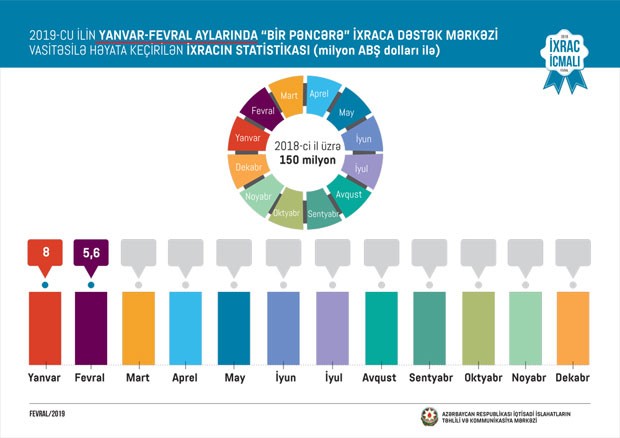 Həmçinin “İxrac İcmalı”nda göstərilib ki, cari ilin fevral ayında “Bir Pəncərə” İxraca Dəstək Mərkəzi vasitəsi ilə həyata keçirilən qeyri-neft ixracının dəyəri isə 5,6 milyon ABŞ dolları təşkil edib.
