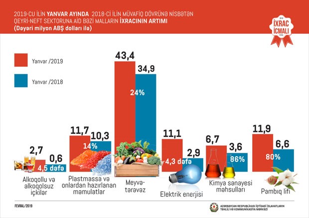 Cari ilin yanvar ayında 2018-ci ilin müvafiq dövrü ilə müqayisədə alkoqollu və alkoqolsuz içkilərin ixracı 4,5 dəfə, elektrik enerjisinin ixracı 4,3 dəfə, kimya sənayesi məhsullarının ixracı 86 faiz, pambıq lifinin ixracı 80 faiz, meyvə-tərəvəzin ixracı 24 faiz, plastmassa və onlardan hazırlanan məmulatların ixracı 14 faiz artıb.