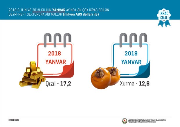 2019-cu ilin yanvar ayı ərzində ixrac edilən qeyri-neft sektoruna aid malların siyahısında xurma (12,6 milyon ABŞ dolları) birinci, qabığı təmizlənmiş meşə fındığı (12 milyon ABŞ dolları) ikinci yerdə qərarlaşıb. Mahlıc isə (11,9 milyon ABŞ dolları) bu siyahıda üçüncü olub.