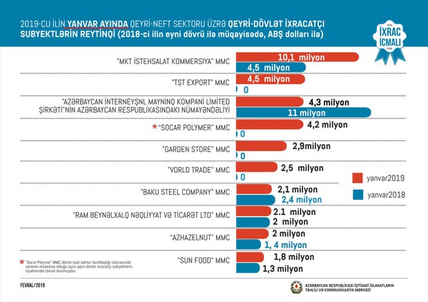 “İxrac İcmalı”nın fevral sayında qeyri-neft sektoru üzrə əsas ixracatçı şirkətlərin reytinqi də verilib. 2019-cu ilin yanvar ayında qeyri-neft sektoru üzrə qeyri-dövlət ixracatçı şirkətlərin siyahısında ilk onluqda "MKT İstehsalat Kommersiya" MMC, "TST Export" MMC, “Azərbaycan İnterneyşnl Mayninq Kompani Limited Şirkəti”nin Azərbaycan Respublikasındakı nümayəndəliyi, “Socar Polymer” MMC, “Garden Store" MMC, "Vorld Trade" MMC, "Baku Steel Company" MMC, "Ram Beynəlxalq Nəqliyyat və Ticarət LTD" MMC, “Azhazelnut” MMC, “Sun Food” MMC təmsil olunub.
