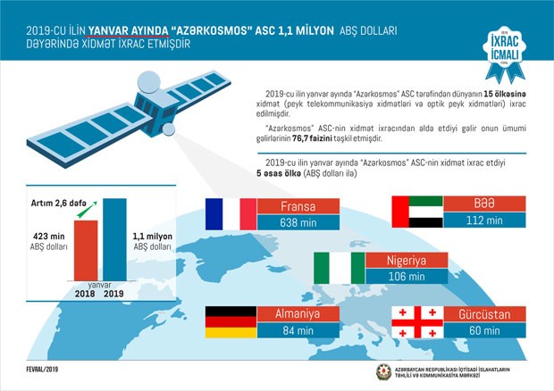 “İxrac İcmalı”nda həm də xidmət ixracına yer ayrılıb. Göstərilib ki, 2019-cu ilin yanvar ayında “Azərkosmos” ASC tərəfindən dünyanın 15 ölkəsinə peyk telekommunikasiya xidmətləri ixrac edilib. Cari ilin ilk ayında “Azərkosmos” ASC peyk telekommunikasiya xidmətlərinin (Azerspace-1) ixracından 1,1 milyon ABŞ dolları məbləğində gəlir əldə edib. 2018-ci ilin yanvar ayı ilə müqayisədə “Azərkosmos” ASC-nin xidmət ixracı 2,6 dəfə artıb.