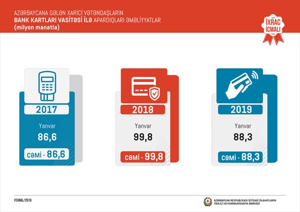 “İxrac İcmalı”nda məlumat verilib ki, 2019-cu ilin yanvar ayında Azərbaycana gələn xarici vətəndaşların bank kartları vasitəsi ilə apardıqları əməliyyatların dəyəri 88,3 milyon manat təşkil edib.