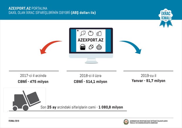 Ümumilikdə isə 2017-ci ilin yanvar ayından 2019-cu ilin 31 yanvar tarixinə kimi Azexport.az portalına dünyanın 118 ölkəsindən daxil olan ixrac sifarişlərinin dəyəri isə 1 080,8 milyon ABŞ dolları təşkil edib.