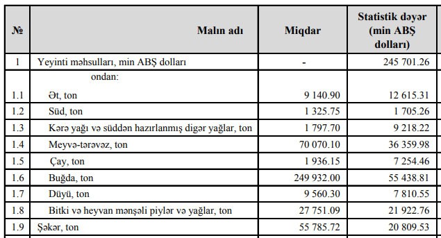2018-ci ilin yanvar-fevral dövründə cəmi yeyinti məhsulları idxalı 206 milyon 744 min manat ikən cari ilin eyni dövründə 245 milyon 701 min manat təşkil edib. Azərbaycana ət, süd, şəkər, meyvə-tərəvəz və buğda idxalı artıb.