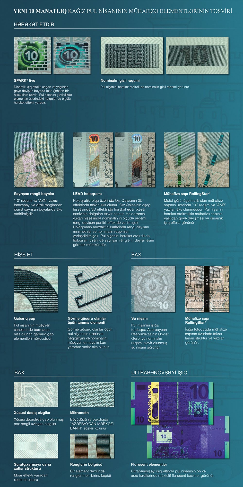 Pul nişanının arxa tərəfində isə üzərində işıqda görünən "10" rəqəmi və "AMB" yazısı olan pəncərə tipli, rəngi yaşıldan göyə dəyişən yeni mühafizə sapı (Rolling Star®) yerləşir. Eyni zamanda, üzərində "10 AZN" yazıları olan sayrışan bənövşəyi və qızılı rəngli zolaqlar əks etdirilmişdir",- məlumatda deyilir.