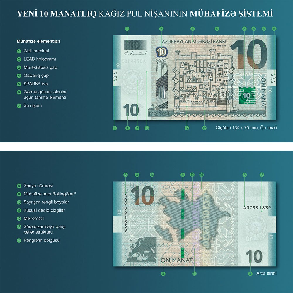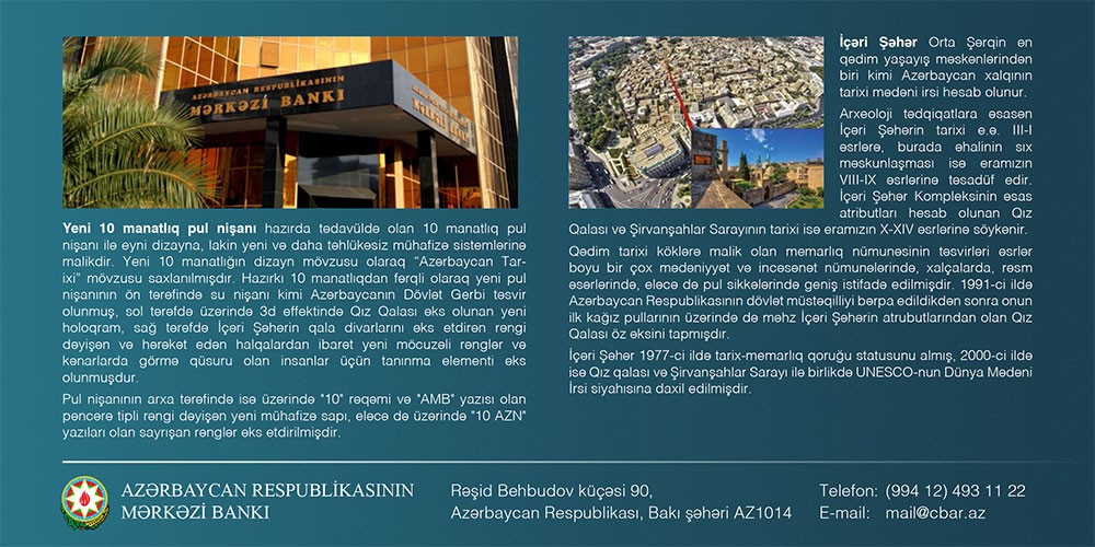 "Mərkəzi Bank tərəfindən dizayn mövzusu “Azərbaycan tarixinə” həsr olunmuş 10 manatlıq pul nişanının təkmilləşdirilməsi və mühafizə elementlərinin müasirləşdirilərək daha yüksək standartlara uyğulaşdırılması həyata keçirilmişdir.