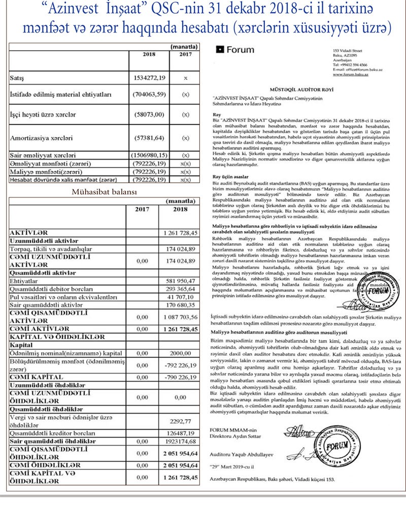 Sosial mənzillərin tikintisinin həvalə edildiyi şirkətlərdən birinin təsisçisi “Azİnvest İnşaat” QSC 2018-ci ili 792 min manat zərər ilə başa vurub.