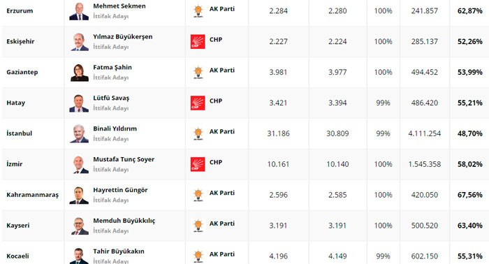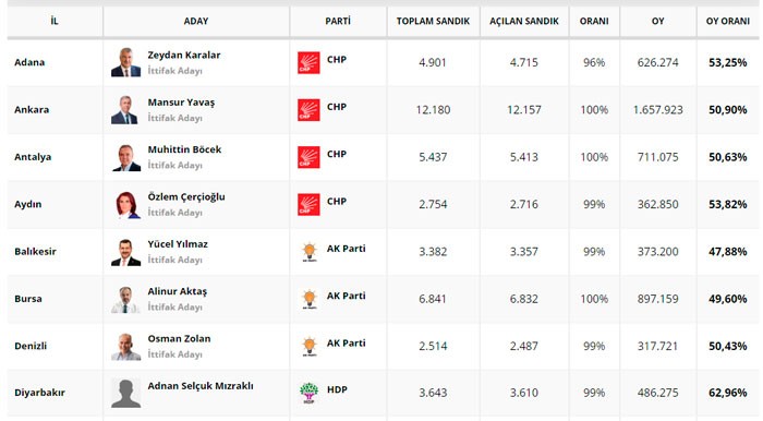 İstanbulda "AK Parti"dən namizəd Binali Yıldırım 48,70%-lə, Ankarada Cümhuriyyət Xalq Partiyasından (CHP) namizəd Mansur Yavaş (50,90%), İzmirdə də CHP-dən Mustafa Tunc Soyer (58,02%) qalib gəlib.