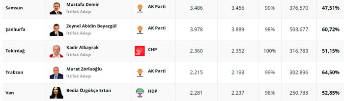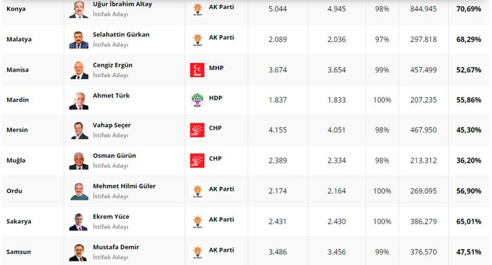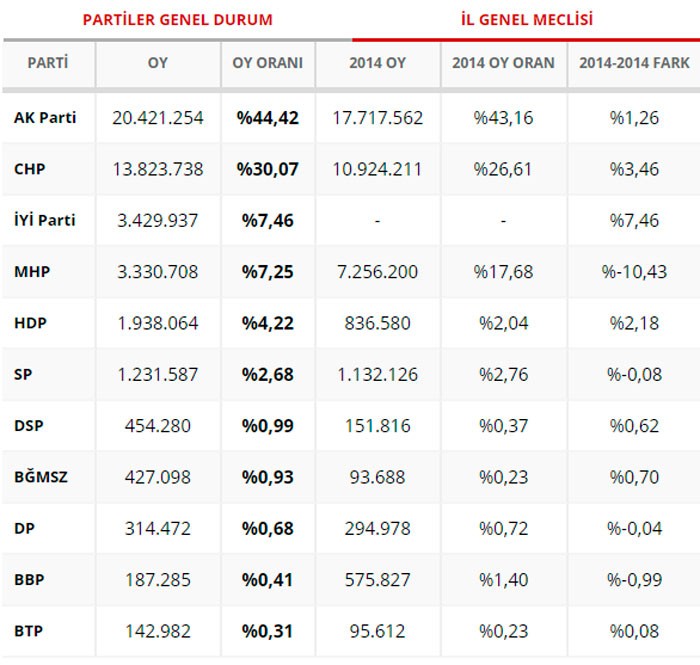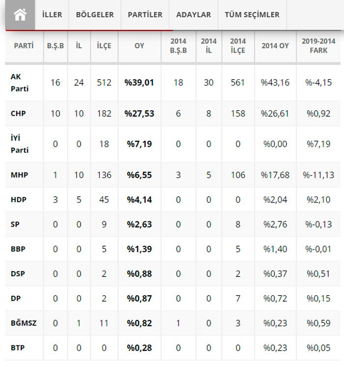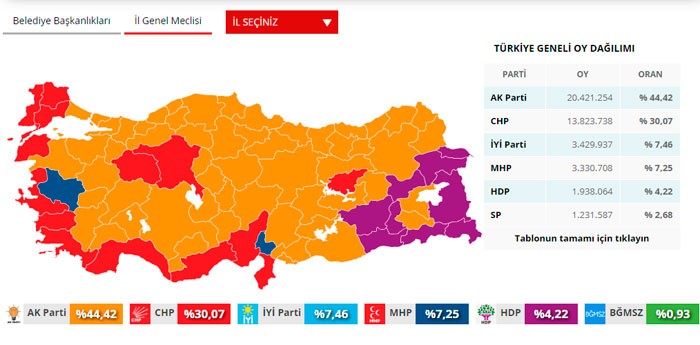 AK PARTİ 44,42%, CHP 30,07%, İYİ PARTİ, 7,46%, MHP 7,25%, HDP 4,22%, SAADET 2,68%,DSP 0,99%, Müstəqil 0,93%, DP 0,68%, BBP 0,41%, BTP 0,31%, VATAN 0,23%, TKP 0,14%.