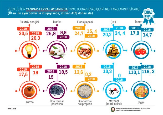 2018-ci ilin müvafiq dövrü ilə müqayisədə cari ilin yanvar-fevral aylarında pambıq lifinin ixracı 2,6 dəfə, alkoqollu və alkoqolsuz içkilərin ixracı 2,5 dəfə, kimya sənayesi məhsullarının ixracı 90 faiz, elektrik enerjisinin ixracı 50 faiz, meyvə-tərəvəzin ixracı 30 faiz, plastmassa və onlardan hazırlanan məmulatların ixracı 26 faiz artıb.