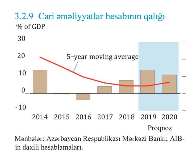 Cari əməliyyatlar hesabının profisitinin 2020-ci ildə yenə də 10.8%-dək azalmaqdan öncə 2019-cu ildə ÜDM-in 13.6%-dək artacağı gözlənilir. Qaz ixracatının artmasına baxmayaraq, orta hesabla neft qiymətlərinin enməsi 2019-cu ildə cəmi ixracatı 7.5% azaldacaq, ondan sonra isə Şah Dəniz 2 meydanında qaz hasilatının artırılması ixracatı 2020-ci ildə 1.0% həcmində artıracaqdır. Lakin, maşınqayırma və avtomobil sənayesinin məhsulları üzrə gömrük rüsumlarının artırılması səbəbindən 2019-cu ildə idxalın 19.9% həcmində azalması ehtimalından çıxış edərək ixracatın azalması artıqlaması ilə neytrallaşdırılacaqdır. Gömrük rüsumlarının təsiri azaldıqca artan daxili tələbatın ödənilməsi üçün 2020-ci ildə idxalın 11.1% həcmində bərpa olacağı gözlənilir. Şah Dəniz 2 meydanında tikinti işləri başa çatdıqca xidmətlərdə kəsirin 2019-cu ildə 6.7%, 2020-ci ildə isə 7.1% həcmində daralacağı proqnozlaşdırılır. Lakin, xarici investorlar karbohidrogen gəlirlərinin böyük hissəsini repatriasiya edəcəklərindən gəlir kəsiri 2019-cu və 2020-ci illərdə daha da genişlənə bilər.