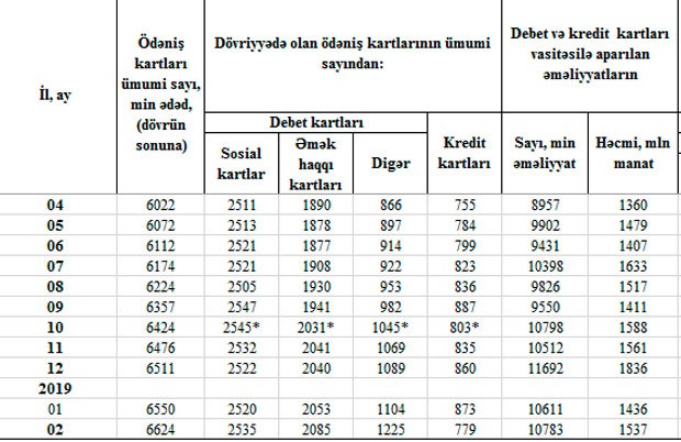 2018-ci ilin sonu ilə müqayisədə isə yanvar-fevral ayları ərzində cəmi ödəniş kartlarının sayı 113 min ədəd, o cümlədən sosial kartların sayı 13 min ədəd, əmək haqqı kartlarının sayı 45 min ədəd, sosial kart və əməkhaqqı kartı olmayan digər debet kartlarının sayı isə 136 min ədəd artıb. Kredit kartlarının sayı isə 81 min ədəd azalıb.
