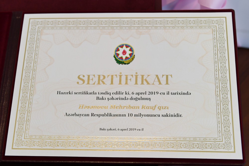 Prezident İlham Əliyev: Bu, Həsənova Mehriban Rauf qızının sertifikatıdır. Ölkəmizin 10 milyonuncu sakinidir. Bunu sizə təqdim edirəm.