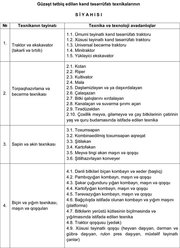 Kənd Təsərrüfatı Nazirliyi güzəşt tətbiq edilən kənd təsərrüfatı texnikalarının siyahısını genişləndirib. Yenilənmiş siyahıda 11 təyinat istiqaməti üzrə 60-dan artıq texnika və avadanlıq növü yer alıb.