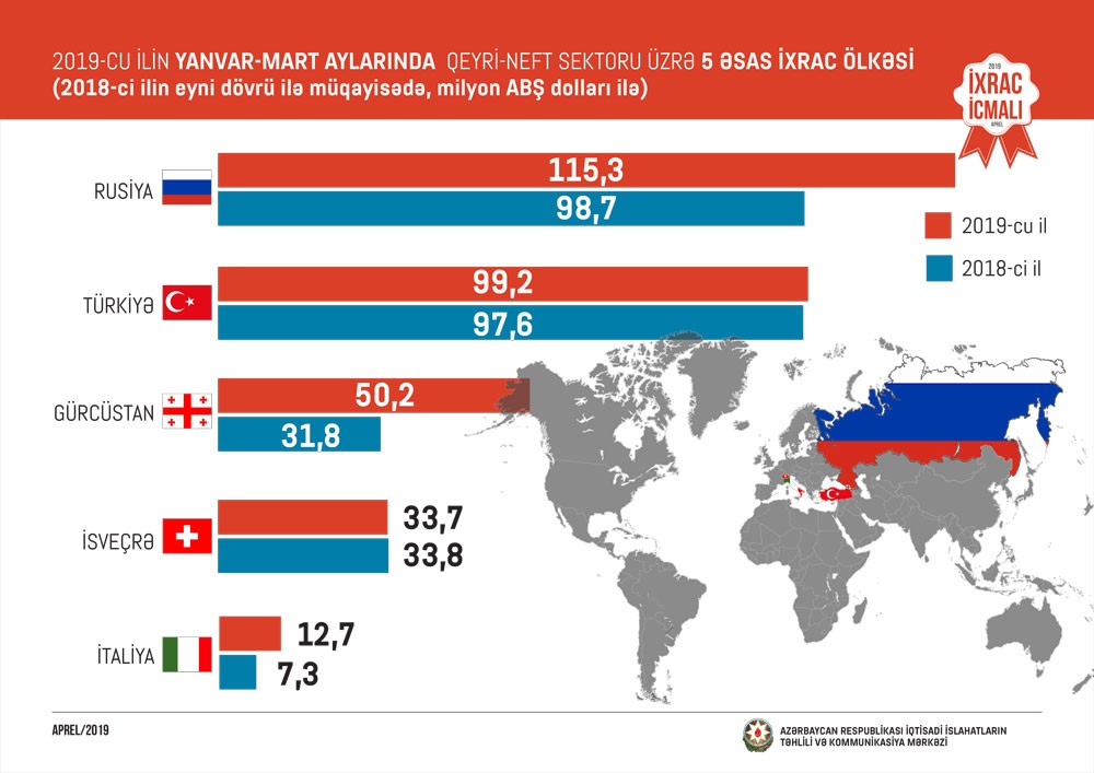 2018-ci ilin müvafiq dövrü ilə müqayisədə 2019-cu ilin ilk üç ayında Rusiyaya qeyri-neft ixracı 17%, Türkiyəyə 2%, Gürcüstana 58%, İtaliyaya 74% artıb.