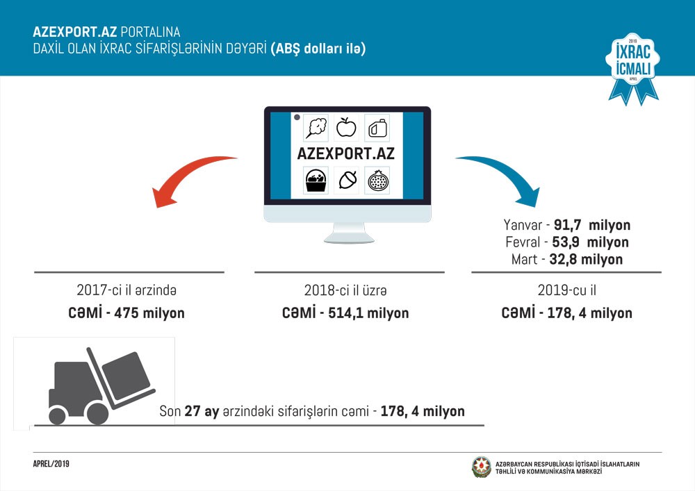Məlumat üçün qeyd edək ki, 2017-ci ilin yanvar ayından 2019-cu ilin 31 mart tarixinə kimi (27 ay ərzində) Azexport.az portalına dünyanın 126 ölkəsindən daxil olan ixrac sifarişlərinin dəyəri 1 167,5 milyon ABŞ dolları təşkil edib.