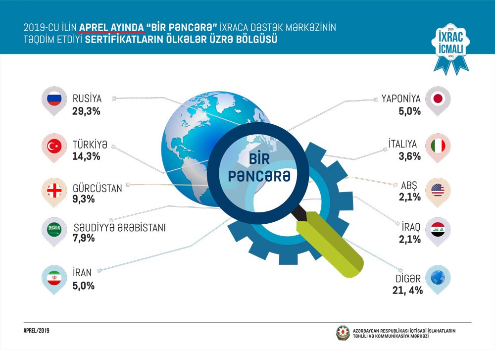 Həmçinin “İxrac İcmalı”nda göstərilib ki, bu ilin aprel ayında “Bir Pəncərə” İxraca Dəstək Mərkəzi vasitəsi ilə həyata keçirilən qeyri-neft ixracının dəyəri isə 9,9 milyon ABŞ dolları olub. 2019-cu ilin yanvar-aprel ayları ərzində “Bir Pəncərə” İxraca Dəstək Mərkəzi tərəfindən yüzlərlə sahibkara ixracla bağlı müvafiq sertifikatlar verilib və bunun nəticəsində 30,5 milyon ABŞ dolları dəyərində qeyri-neft ixracı həyata keçirilib.
