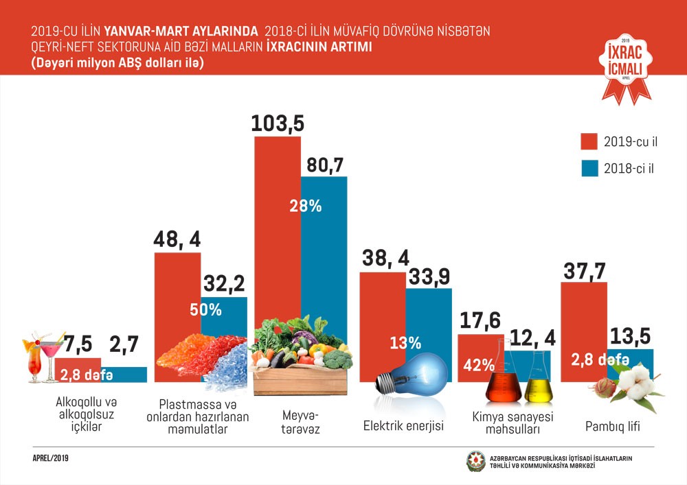 2018-ci ilin müvafiq dövrü ilə müqayisədə cari ilin yanvar-mart aylarında pambıq lifinin ixracı 2,8 dəfə, alkoqollu və alkoqolsuz içkilərin ixracı 2,8 dəfə, plastmassa və onlardan hazırlanan məmulatların ixracı 50 faiz, kimya sənayesi məhsullarının ixracı 42 faiz, pambıq ipliyinin ixracı 34 faiz, meyvə-tərəvəzin ixracı 28 faiz, elektrik enerjisinin ixracı 13 faiz artıb.
