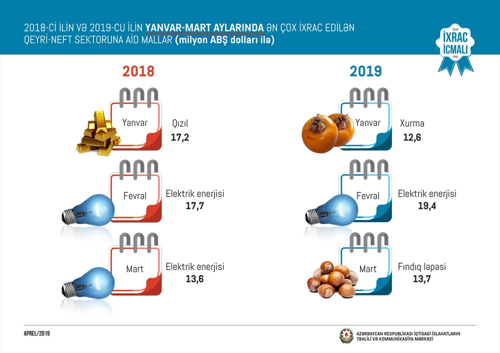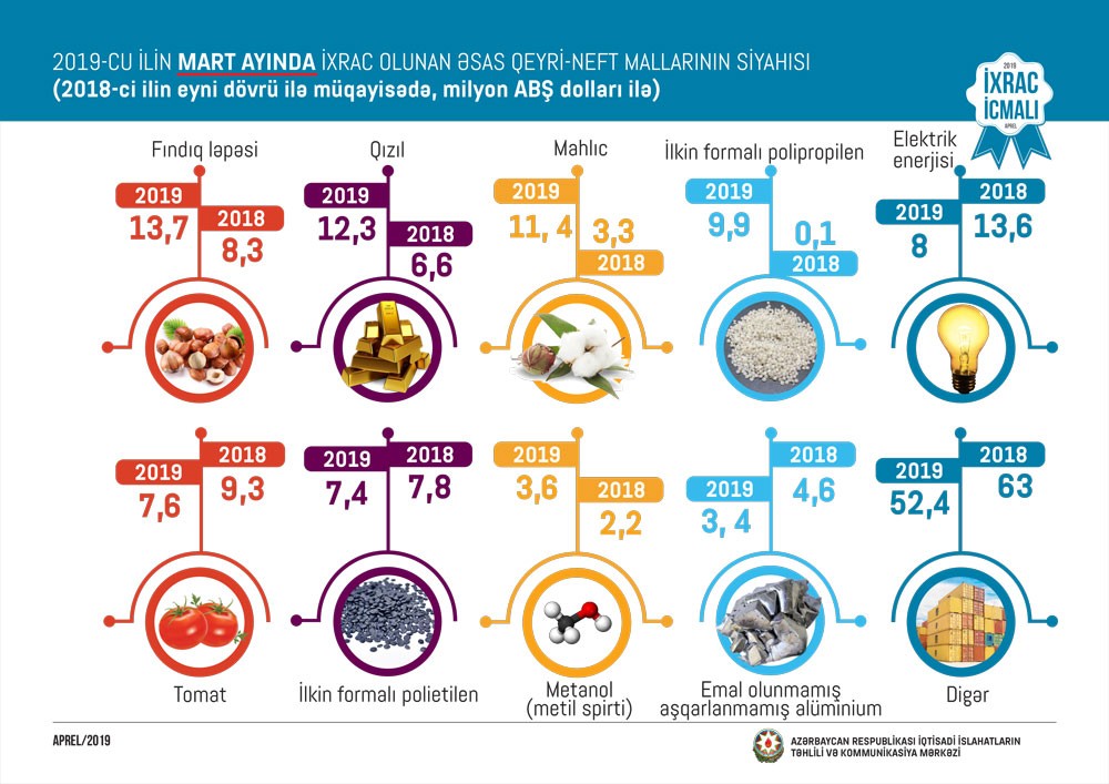 2019-cu ilin mart ayında isə qeyri-neft sektoru üzrə ixrac 133,7 milyon ABŞ dolları təşkil edib. Bu ilin mart ayında qeyri-neft sektoruna aid ən çox mal Türkiyəyə (35,7 milyon ABŞ dolları), Rusiyaya (33,3 milyon ABŞ dolları) və Gürcüstana (13,2 milyon ABŞ dolları) ixrac edilib.