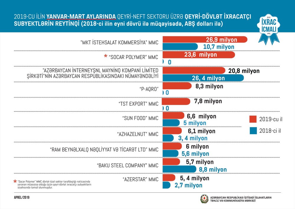 “İxrac İcmalı”nın aprel sayında qeyri-neft sektoru üzrə əsas ixracatçı şirkətlərin reytinqi verilib. Bu ilin yanvar-mart ayları üzrə hazırlanan qeyri-dövlət ixracatçı subyektlərin reytinqində ilk onluqda aşağıdakı şirkətlər təmsil olunurlar: "MKT İstehsalat Kommersiya" MMC, “Socar Polymer” MMC, "Azərbaycan İnterneyşnl Mayninq Kompani Limited Şirkəti"nin Azərbaycan Respublikasındakı nümayəndəliyi, "P-Aqro" MMC, "TST Export" MMC, "Sun Food" MMC, “Azhazelnut” MMC, "Ram Beynəlxalq Nəqliyyat və Ticarət LTD" MMC, "Baku Steel Company" MMC, "Azerstar" MMC.