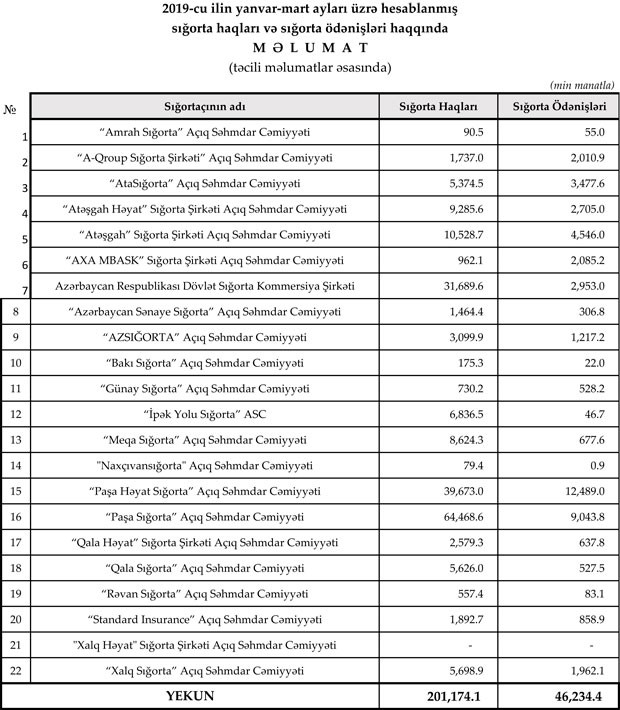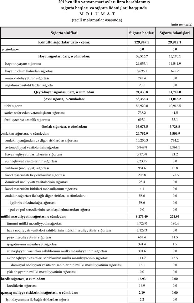 Müqayisə üçün edək ki, 2018-ci ilin yanvar-mart ayları ərzində ölkədə fəaliyyət göstərən 21 sığorta şirkəti tərəfindən 193.1 milyon manat məbləğində sığorta haqları toplanmış, 60.3 milyon manat məbləğində sığorta ödənişi aparılmışdı.