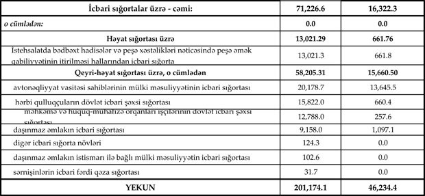 Könüllü sığorta bazarı üzrə haqlar 130 milyon manat, ödənişlər isə 29.9 milyon manat təşkil edib. İcbari sığorta bazarı üzrə haqlar 71.2 milyon manat, ödənişlər isə 16.3 milyon manat olub.