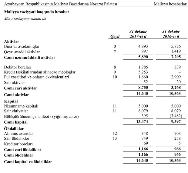 Maliyyə Bazarlarına Nəzarət Palatası (MBNP) 2017-ci ili 3 milyon 887 min manat mənfəətlə başa vurub. Halbuki, qurum bir əvvəlki ildən 3 milyon 482 min manat zərərlə çıxmışdı.