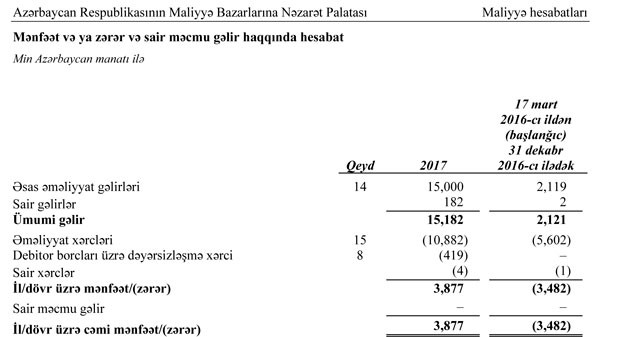 2017-ci ildə MBNP-nin əsas əməliyyat gəlirləri 15 milyon manat (7,1 dəfə çox), sair gəlirləri 182 min manat (91 dəfə çox), əməliyyat xərcləri 10 milyon 882 min manat (94,25% çox), debitor borcların dəyərsizləşməsi üzrə xərcləri 419 min manat (əvvəlki il olmayıb), sair xərcləri isə 4 min manat (4 dəfə çox) təşkil edib. Son nəticədə Palata ili 3 milyon 887 min manat mənfəətlə başa vurub.