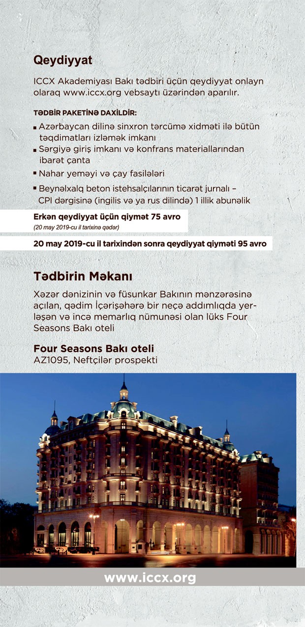 ICCX Avropanın mötəbər qurumlarından olub, 20 ilə yaxın müddət ərzində dünyanın bir çox inkişaf etmiş ölkələrində beton sahəsində beynəlxalq konfranslara təşkilatçılıq etmişdir. ICCX ticarət nişanı müasir beton istehsalı və texnologiyasının bütün aspektlərini əhatə edən konfrans və ticarət sərgisinin unikal birləşməsidir.