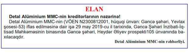 "Marja" MMC-nin "kreditorlarının nəzərinə" başlığı ilə rəsmi mətbuatda dərc etdirdiyi elanına istinadən xəbər verir ki, "Detal Alüminium" MMC-nin iflas edilməsinə dair işə 29 May 2019-cu il tarixində Gəncə şəhəri İnzibati-İqtisad məhkəməsində baxılacaqdır.