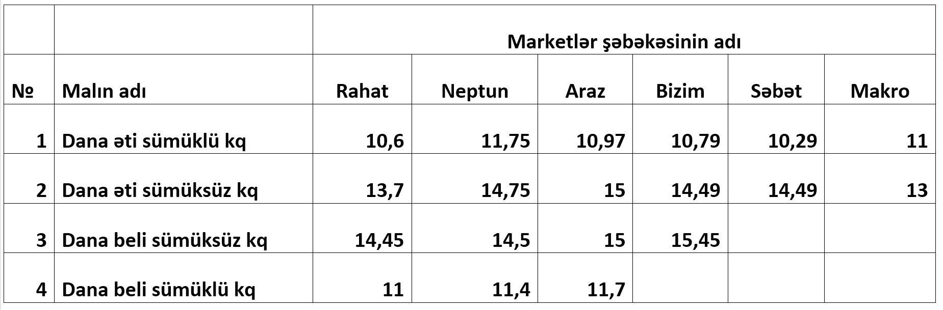 Bakıda yerləşən ən böyük marketlər şəbəkələri arasında qiymətlərlə bağlı araşdırma aparılıb. Aşağıda həmin araşdırmanın nəticələrini əks etdirən cədvəli təqdim edirik: